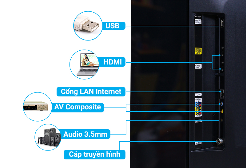 Nếu muốn kết nối tivi với dàn máy, đầu đĩa bạn có thể dùng cổng AV Component. Ngoài ra tivi còn có giắc loa 3.5 mm tiện lợi.